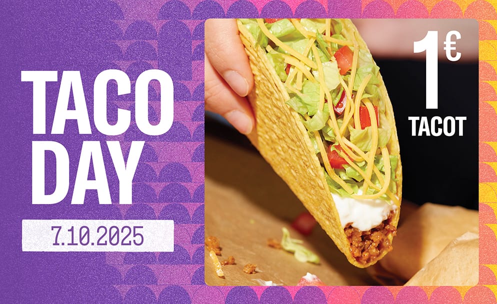 Kansainvälisen Taco Dayn kunniaksi tarjoamme Tacot nyt vain 1€ hintaan🥳 Tarjous on voimassa vain tänään 7.10., joten tilaa tai nouda nyt.🌮 Ei voimassa klo 22 jälkeen.