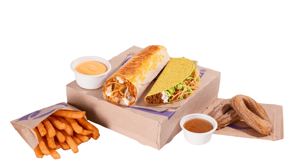 Nacho Cheese Drip Burrito Box sisältää Nacho Cheese Drip Burriton, lisuke (ranskalaiset tai Nachot), dippi, Taco Supreme sekä Churros 2 kpl + suklaakastike.